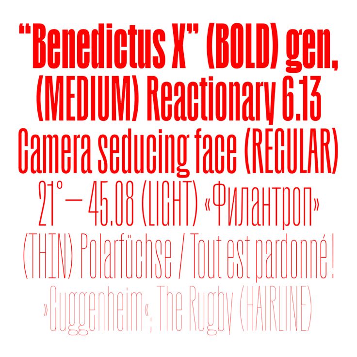 В основном есть два фронта работы: в первом случае это шрифты для эксклюзивного использования конкретными компаниями, когда клиент платит за шрифт, который будет изготовлен для его собственного проекта. В этой ситуации не нужно беспокоиться о среднем пользователе, рынке или продажах, что является преимуществом, но мало кто знает об этих вакансиях. В качестве альтернативы, во втором случае, я работал в известных журналах, которые всегда были более или менее на виду у публики.Например, я сделал важный проект для журнала «Большой город» — большое семейство шрифтов под названием Big City Sans , которое затем установило личный рекорд как по количеству символов, так и по количеству начертаний. Этот дизайн был хорошо принят профессиональным сообществом и получил несколько призов. Вот тогда-то и началось это дело с кириллическими вязями — я вижу его продолжение в проектах студентов, которые уже не стесняются рисовать кириллические вязи. по-моему Big City Sans был первым случаем, когда лигатуры появились в таком количестве.