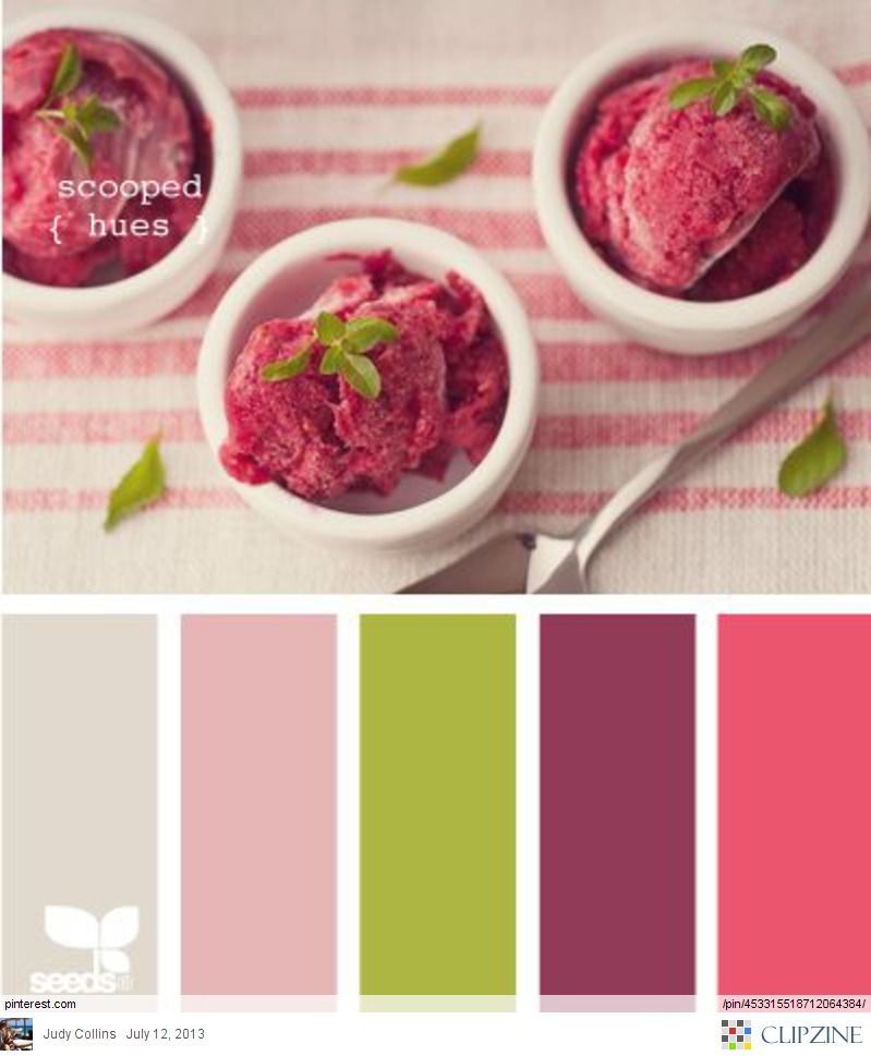 Сочетание малинового и теплого зеленого то же летнее, естественное, но отличается небольшим тепловым контрастом, который придает паре сбалансированность. Гармония так же спрятана в приближении участвующих в комбинации цветов к дополнительным (красный и зеленый).