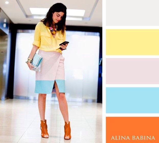 Голубой и светлые оттенки желтого цвета. Сочетание солнца и неба очень подходит для теплого времени года. Дополните образ золотистой сумочкой и украшениями.![]()