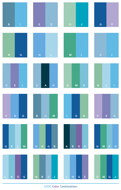 И вместе с другими цветами той же тональности он придаст атмосфере прохладное и свежее течение. Со всеми оттенками себя самого, такими как синий, лазурь, циан, ультрамарин, индиго и др. он естественно сплетается хорошо. Другие холодные течения также прекрасно подходят для сочетания с голубым.
