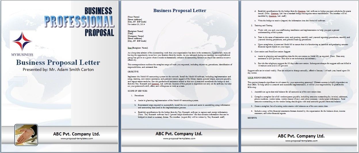 В этом образце используется следующий набор тем пакета предложений: сопроводительное письмо, титульный лист, рынок и аудитория, преимущества, параметры, задняя страница.