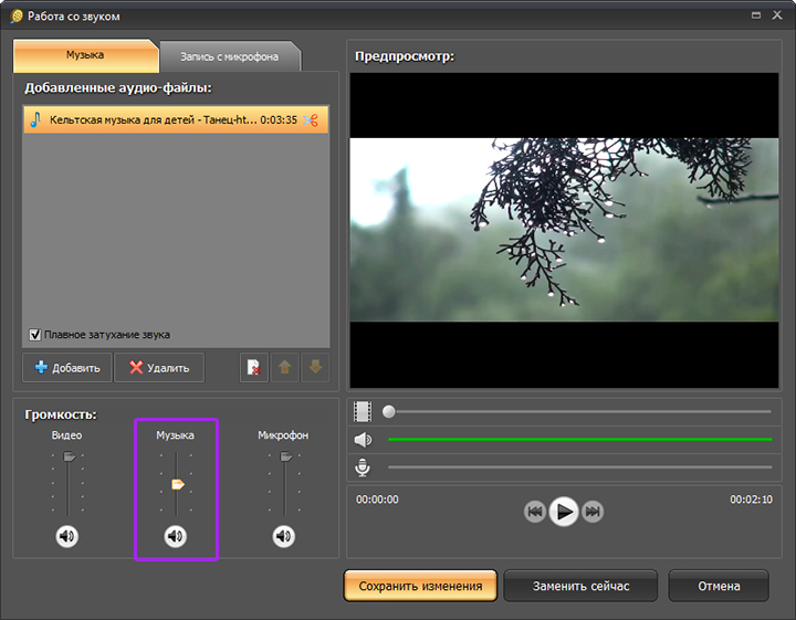 - Нажимаем «Далее». Тут можем выбрать музыкальное сопровождение из предложенных мелодий или загрузить с компьютера.