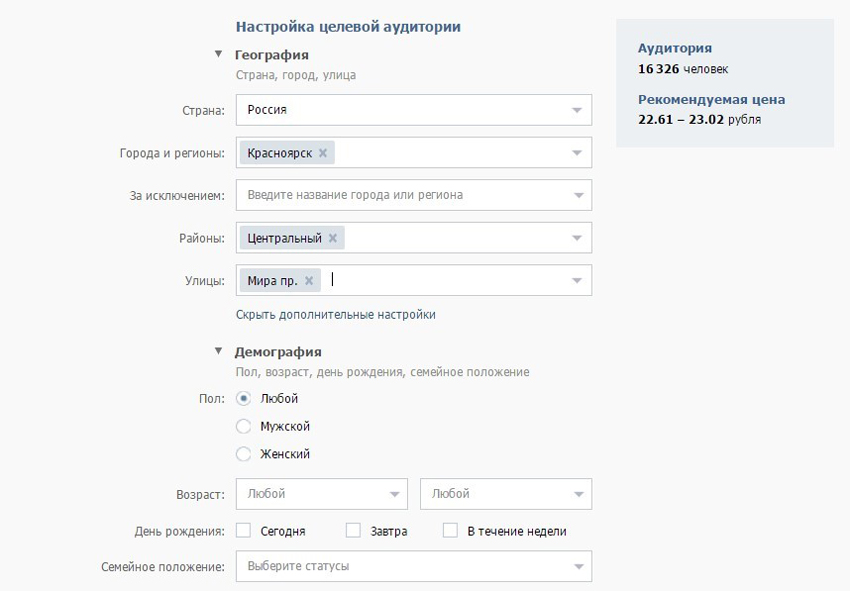 Обратите внимание, при выборе целевой аудитории вы можете воспользоваться стандартными настройками «Вконтакте»