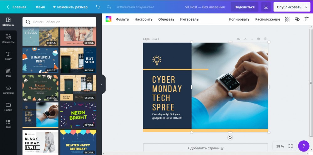 Однако одним из самых отличительных факторов Canva является то, что описанные выше шаги практически одинаковы для документов различных типов, во многом благодаря готовым шаблонам.