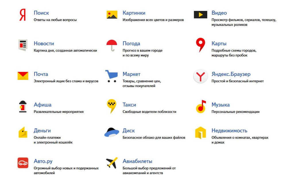 Ключевые услуги: Автосервис Яндекс, Заказ такси, Доставка продуктов, Образовательные проекты, Офис продаж