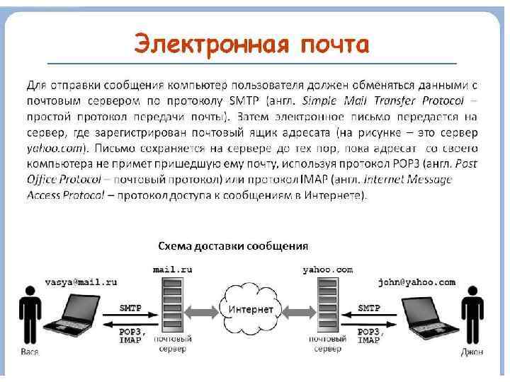 Эти почтовые протоколы передают электронные письма с сервера на используемый вами клиент. Ваш настольный клиент или мобильное приложение получает электронные письма с помощью этих протоколов, чтобы отобразить их локально. После загрузки с сервера электронные письма (также) хранятся локально и могут быть доступны в автономном режиме.
