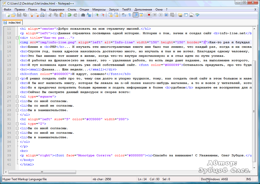 Обратите внимание только на то, что выделено разными цветами: меню (навигация) сайта, имена картинок (при желании), адреса ссылок на страницы (если переименуете их), основное текстовое содержание сайта (обязательно) и, так называемые, мета теги (обязательно), которые находятся в начале кода, нужны для поисковых систем — посещаемости сайта.