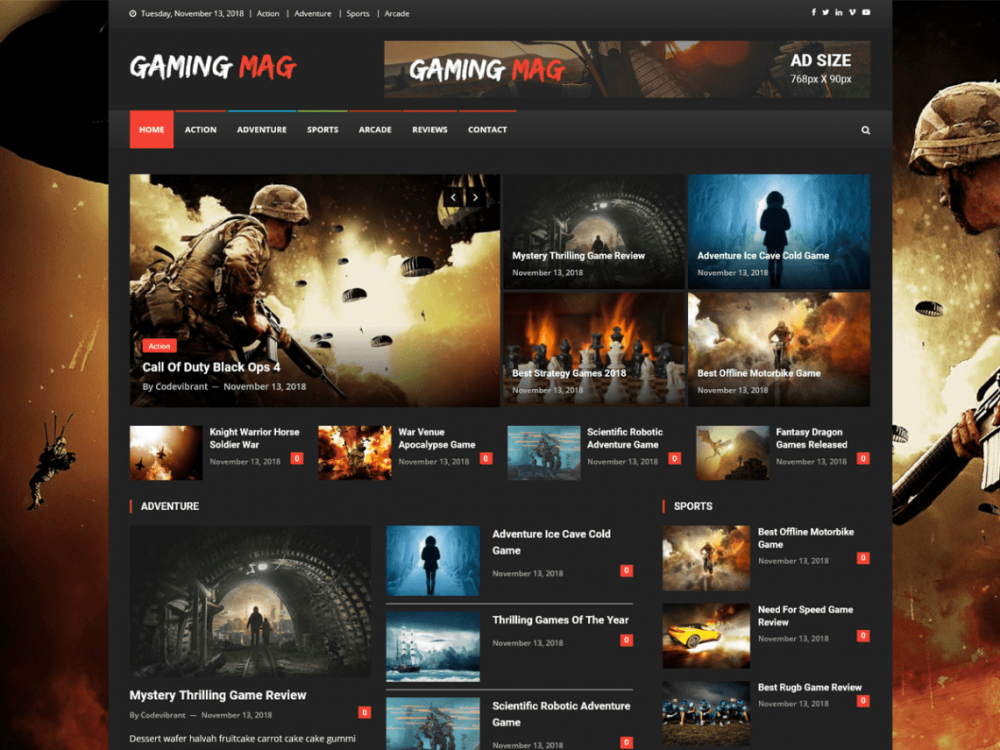 Эта удивительная тема – целый пакет впечатляющих дизайнов и инструментов управления сайтом, которые помогут вам создать геймерский интерфейс. Обладая полнофункциональной панелью параметров темы и интеграцией с WP Builder, можно создавать без особых усилий захватывающие игровые форумы, клановые сайты, новостные каналы и игровые магазины.