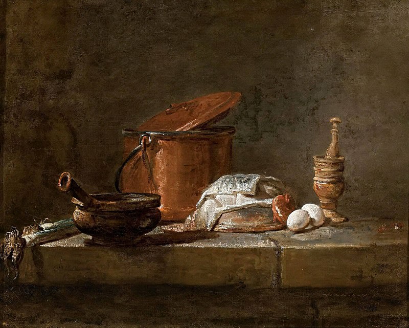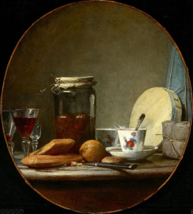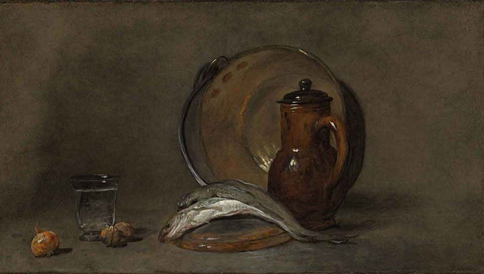 Жан Батист Симеон Шарден был одним из величайших мастеров натюрморта в истории искусства. Стиль живописи заведения в его дни был рококо: претенциозный стиль, переполненный аллегорическими образами из классической мифологии и закрученный витиеватым декором. Для Шардена этот театральный подход сводил искусство к некой интеллектуальной беседе. Он был совершенно чужд тому миру, который он сконструировал — простой мир правды, смирения и спокойствия, разыгранный на нескольких квадратных сантиметрах холста.
