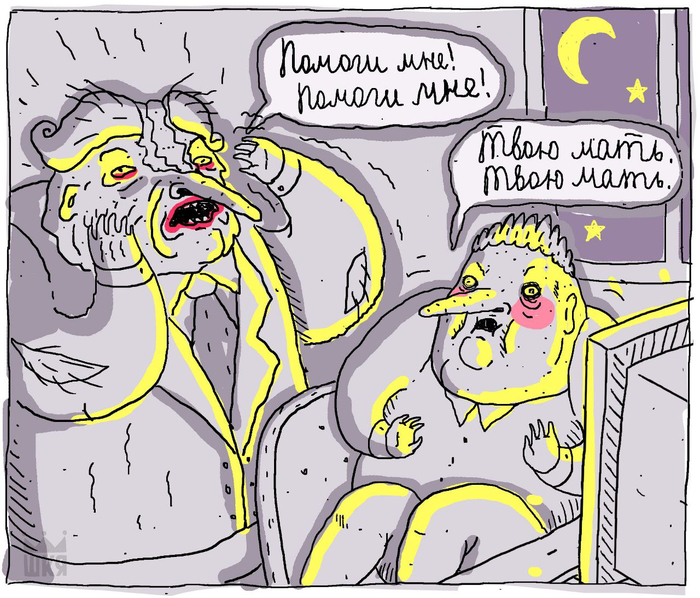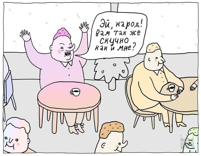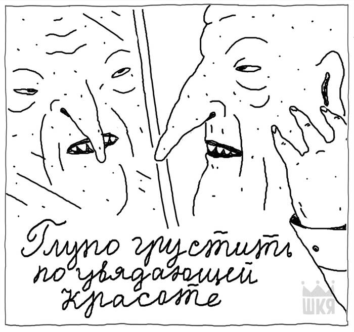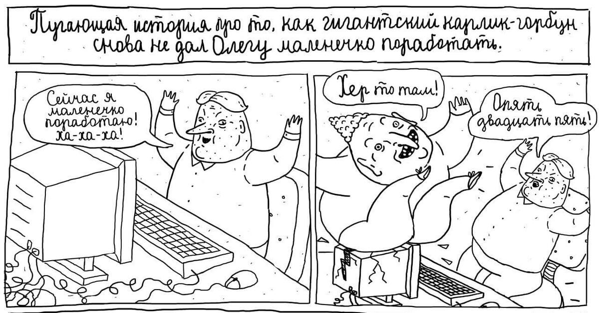 — Даже не знаю, мне так проще характеры обозначить, с трудом представляю праздных олухов, забитых менеджеров и стервозных бабок с правильными чертами лица (в смысле в своих комиксах, а не в жизни)). Да и рисовать такие лица мне гораздо интереснее. Все красивые лица красивы одинаково, а все уродливые — уродливы по-своему, как говорится.
