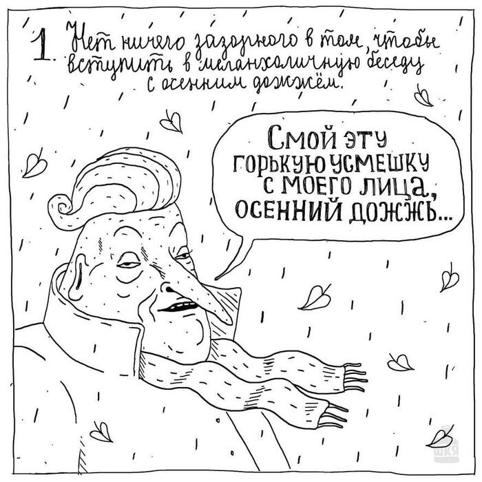 — Да у меня как-то степень хандры от сезона не зависит, равномерно хандрю сквозь год. Вообще я осень люблю, как по мне, она выигрывает у лета практически по всем пунктам.