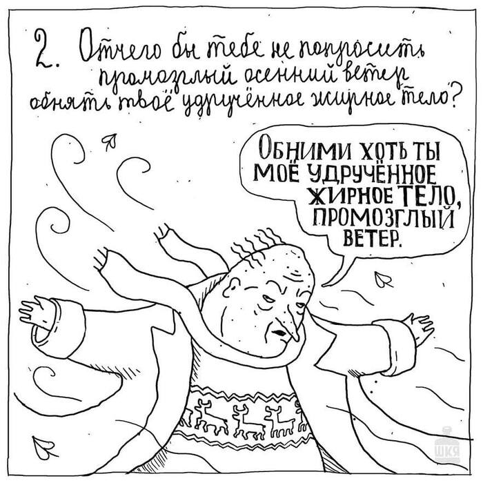 То же самое и со ШКЯ, большую часть сюжетов я стилизую под псевдоинструкции, типа «как веселиться, если ты старый», это короткие абсурдные истории с внезапными концовками, в этом их фишка. Нельзя взять и вырвать содержание из его родной формы и поместить в чужеродную и неуместную форму полнометражного фильма, это ничего не даст, только разрушит то, что было. Это как разобрать велосипед и собрать из этих деталей неудобную табуретку и назвать это эволюцией. Я допускаю, что когда-нибудь мне в голову придёт история, которая хорошо уляжется в полнометражку, но сейчас ногу в перчатку запихивать не надо.