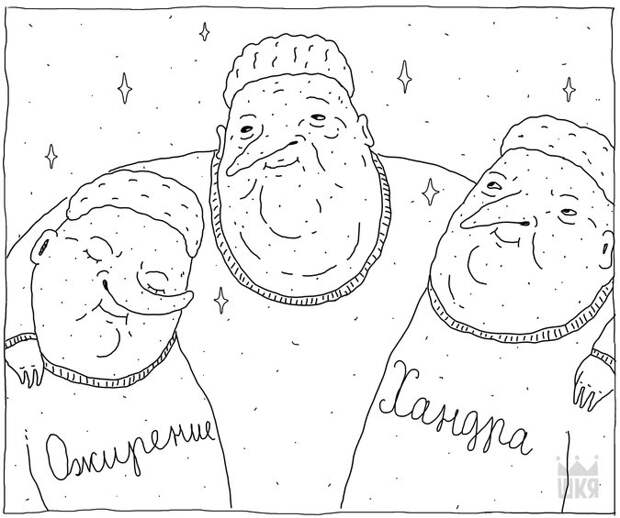 Зато много есть от всяких средневековых гравюр, от старых советских открыток, от плохих иллюстраций разных времён из всяких учебников, от Бивиса и Батхеда, конечно, от Норштейна немножечко, от японской графики, маленько от старого Disney и Adventure Time, ещё от Chris Simpsons Artist, есть такой чувак интересный. У кого-то я стиль рисовки подворовала, у кого-то — мимику персонажей, у кого-то — настроение в целом, в общем, это скорее источники рисовальческого вдохновения я сейчас перечислила.