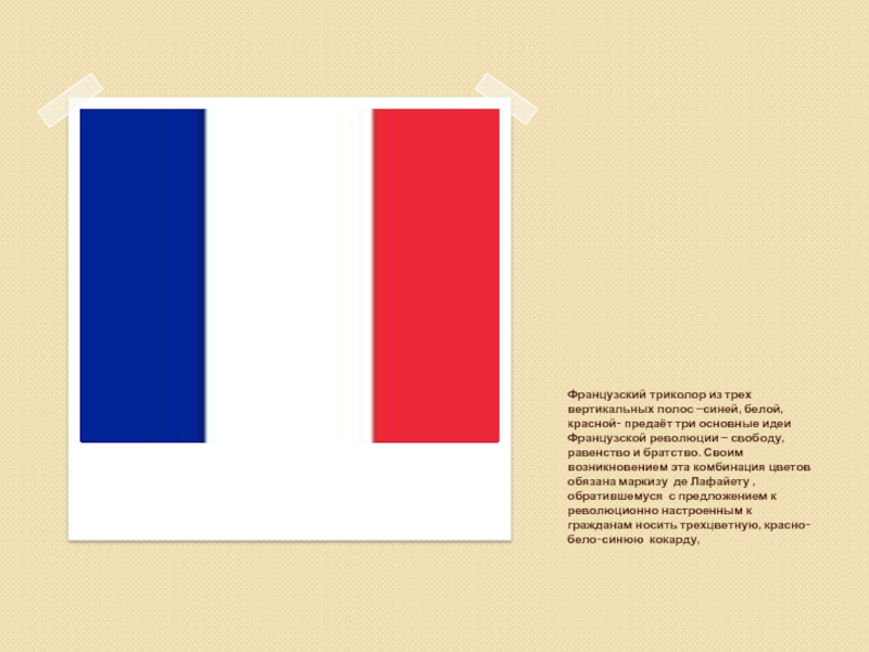 Красный и синий цвета на флаге представляют город Париж. Революционеры в Париже традиционно летали красным и синим. Точно так же революционеры носили синие и красные кокарды (ленты) на шляпах, когда штурмовали Бастилию в 1789 году.