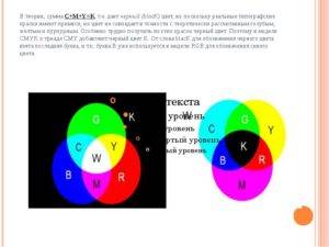 Проблема заключается в том, что данная система неприменима, если речь идет о переносе изображения на бумагу. Бумага не излучает свет, она отражает его. Если нанести на один и тот же участок бумаги красные, зеленые и синие чернила, получится грязно-коричневый цвет, а не белый. Если же на бумаге нет чернил, то она остается белой, а не черной. Поэтому для печати на бумаге используется процесс CMYK-печати.