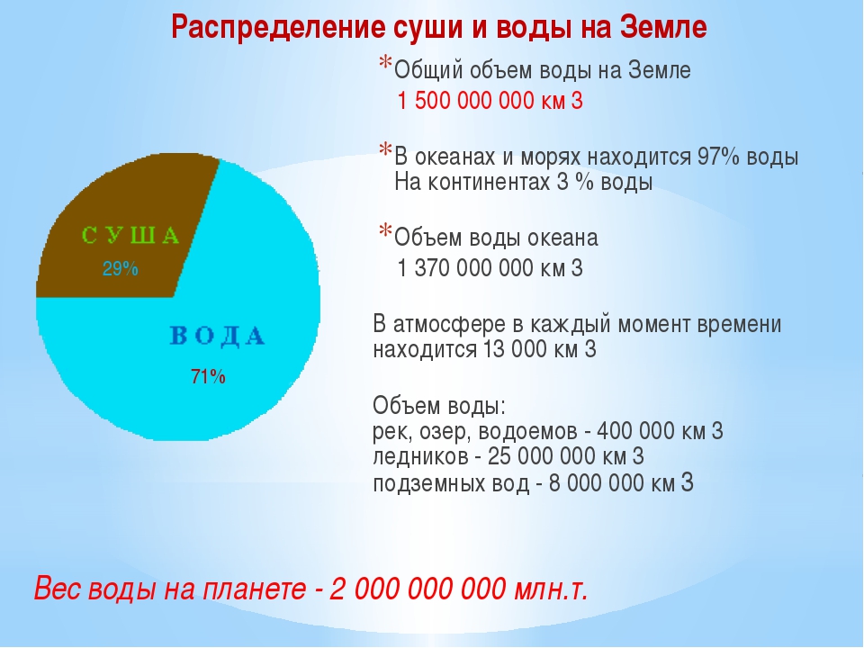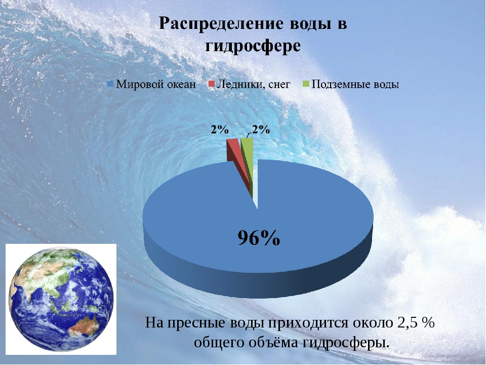 км. Это огромная цифра, и сложно с этим не согласится. При этом 96,4% приходится на соленую воду морей и океанов, а 3,6% — на пресную. Кстати, основную долю пресной воды составляют ледники и подземные воды, а реки и озера – лишь доли процента. Воду, содержащуюся в атмосфере, мы проигнорируем – ее достаточно мало по сравнению с общим объемом.