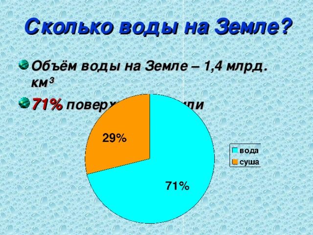 Еще со школьных уроков «Окружающего мира» все знают, что воды на нашей планете очень много. 70% поверхности занимает вода, и всего 30% – суша.