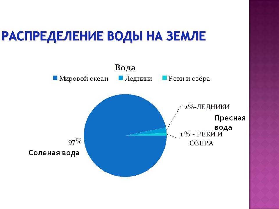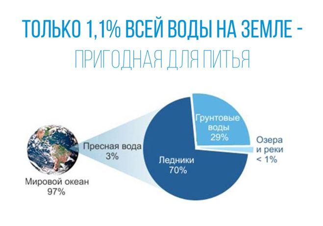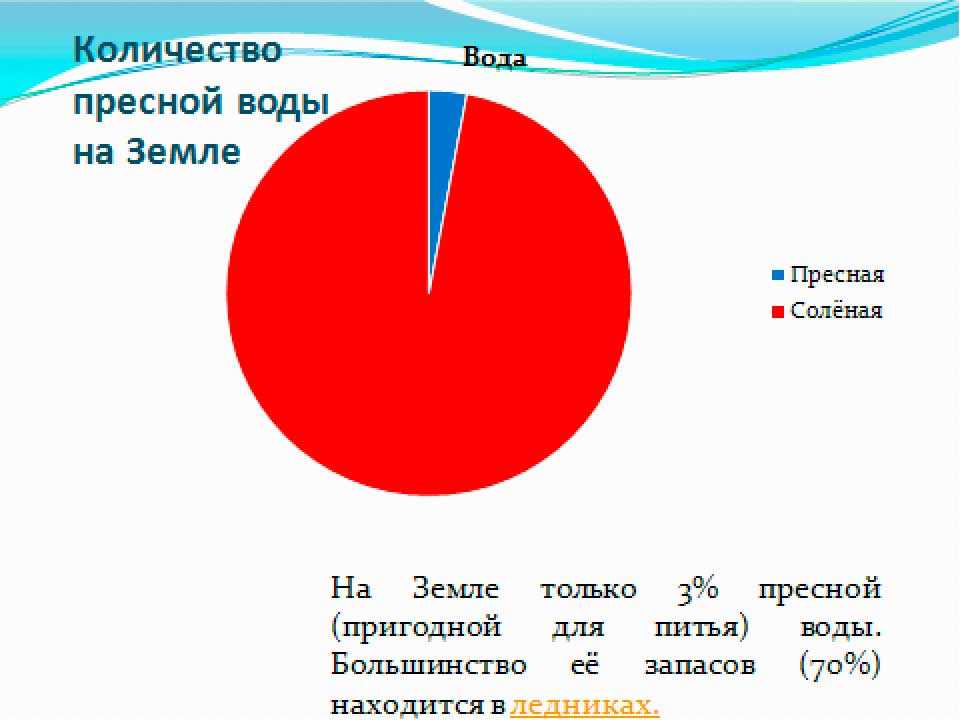 Ухудшающаяся с каждым годом экологическая ситуация на планете, истощение ресурсов, загрязнение окружающей среды – обо всем этом мы слышим каждый день, и уже не оцениваем как реальную опасность. Однако положение с водными ресурсами действительно критическое, и если энергию можно получить от ветра и солнца, то откуда брать пресную воду, без которой не обойдется ни один живой организм? Сколько процентов пресной воды на земле, и как надолго ее хватит (если хватит всем) – остро стоящий вопрос для ведущих экологических институтов мира.