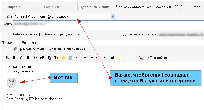 Точно также можно отправить электронное письмо своему родственнику, другу, знакомому, коллеге на их e-mail. Это удобно, например, для новогодних праздников, когда приятно получать поздравления, но уже не хочется самому их отправлять. Пусть работает почтовый робот.