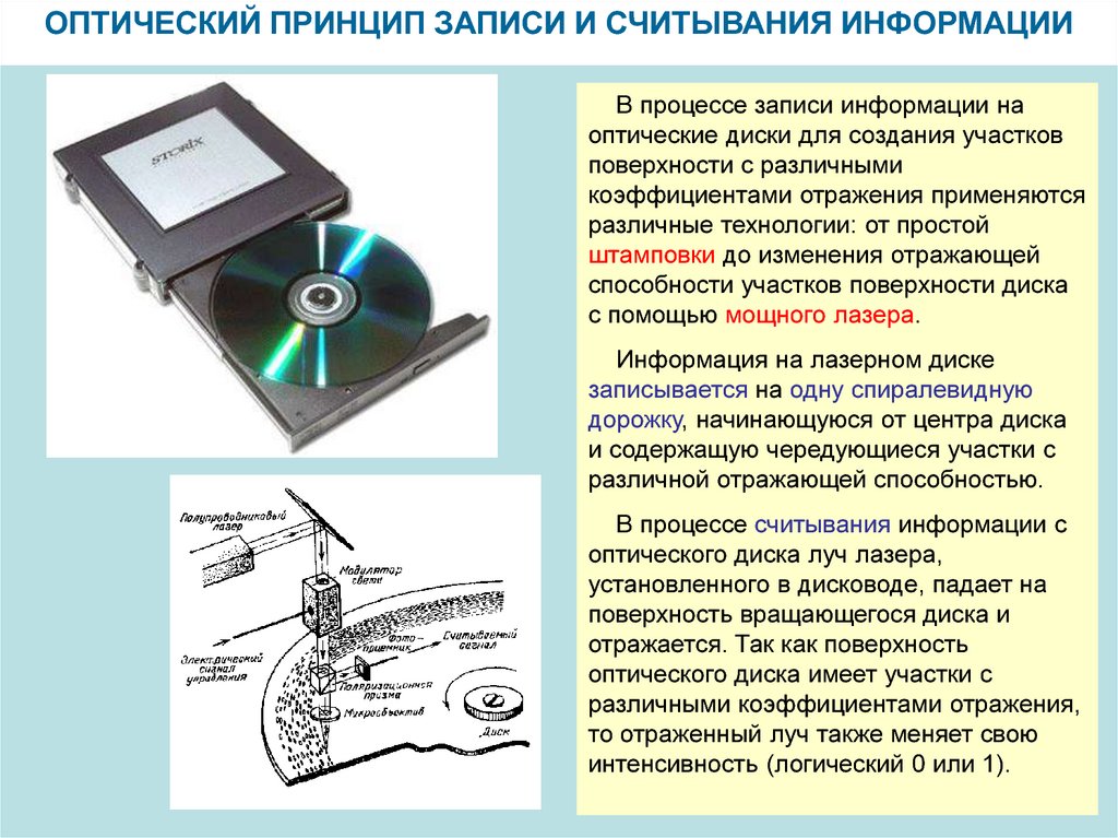 ΠΠ°Π½Π½ΡΠ΅ Π·Π°ΠΏΠΈΡΡΠ²Π°ΡΡΡΡ Π½Π° ΠΎΠΏΡΠΈΡΠ΅ΡΠΊΠΈΠΉ Π΄ΠΈΡΠΊ Π² ΡΠ°Π΄ΠΈΠ°Π»ΡΠ½ΠΎΠΌ ΠΏΠΎΡΡΠ΄ΠΊΠ΅, Π½Π°ΡΠΈΠ½Π°Ρ Ρ ΡΠ΅Π½ΡΡΠ°. ΠΡΠΈΠ²ΠΎΠ΄ ΠΎΠΏΡΠΈΡΠ΅ΡΠΊΠΈΡ Π΄ΠΈΡΠΊΠΎΠ² ΠΈΡΠΏΠΎΠ»ΡΠ·ΡΠ΅Ρ Π»Π°Π·Π΅ΡΠ½ΡΠΉ Π»ΡΡ Π΄Π»Ρ ΡΡΠΈΡΡΠ²Π°Π½ΠΈΡ Π΄Π°Π½Π½ΡΡ Ρ Π΄ΠΈΡΠΊΠ° Π²ΠΎ Π²ΡΠ΅ΠΌΡ Π΅Π³ΠΎ Π²ΡΠ°ΡΠ΅Π½ΠΈΡ. ΠΠ½ ΡΠ°Π·Π»ΠΈΡΠ°Π΅Ρ ΡΠΌΡ ΠΈ Π·Π΅ΠΌΠ»ΠΈ Π² Π·Π°Π²ΠΈΡΠΈΠΌΠΎΡΡΠΈ ΠΎΡ ΡΠΎΠ³ΠΎ, ΠΊΠ°ΠΊ ΡΠ²Π΅Ρ ΠΎΡΡΠ°ΠΆΠ°Π΅ΡΡΡ ΠΎΡ Π·Π°ΠΏΠΈΡΡΠ²Π°Π΅ΠΌΠΎΠ³ΠΎ ΠΌΠ°ΡΠ΅ΡΠΈΠ°Π»Π°. ΠΡΠΈΠ²ΠΎΠ΄ ΠΈΡΠΏΠΎΠ»ΡΠ·ΡΠ΅Ρ ΡΠ°Π·Π½ΠΈΡΡ Π² ΠΎΡΡΠ°ΠΆΠ°ΡΠ΅Π»ΡΠ½ΠΎΠΉ ΡΠΏΠΎΡΠΎΠ±Π½ΠΎΡΡΠΈ Π΄Π»Ρ ΠΎΠΏΡΠ΅Π΄Π΅Π»Π΅Π½ΠΈΡ Π±ΠΈΡΠΎΠ² 0 ΠΈ 1, ΠΊΠΎΡΠΎΡΡΠ΅ ΠΏΡΠ΅Π΄ΡΡΠ°Π²Π»ΡΡΡ Π΄Π°Π½Π½ΡΠ΅.