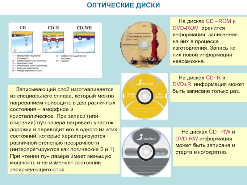 ΠΠΏΡΠΈΡΠ΅ΡΠΊΠΈΠ΅ Π΄ΠΈΡΠΊΠΈ ΠΈΡΠΏΠΎΠ»ΡΠ·ΡΡΡ ΠΊΡΠ°ΡΠ½ΡΠΉ ΠΈΠ»ΠΈ ΡΠΈΠ½ΠΈΠΉ Π»Π°Π·Π΅Ρ Π΄Π»Ρ Π·Π°ΠΏΠΈΡΠΈ ΠΈ ΡΡΠΈΡΡΠ²Π°Π½ΠΈΡ Π΄Π°Π½Π½ΡΡ . ΠΠΎΠ»ΡΡΠΈΠ½ΡΡΠ²ΠΎ ΡΠΎΠ²ΡΠ΅ΠΌΠ΅Π½Π½ΡΡ ΠΎΠΏΡΠΈΡΠ΅ΡΠΊΠΈΡ Π΄ΠΈΡΠΊΠΎΠ² ΠΏΠ»ΠΎΡΠΊΠΈΠ΅, ΠΊΡΡΠ³Π»ΡΠ΅ ΠΈ ΠΈΠΌΠ΅ΡΡ Π΄ΠΈΠ°ΠΌΠ΅ΡΡ 12 ΡΠ°Π½ΡΠΈΠΌΠ΅ΡΡΠΎΠ². ΠΠ°Π½Π½ΡΠ΅ Ρ ΡΠ°Π½ΡΡΡΡ Π½Π° Π΄ΠΈΡΠΊΠ΅ Π² Π²ΠΈΠ΄Π΅ ΠΌΠΈΠΊΡΠΎΡΠΊΠΎΠΏΠΈΡΠ΅ΡΠΊΠΈΡ ΡΠΌΠΎΠΊ ΠΈ ΡΡΠ°ΡΡΠΊΠΎΠ² Π΄Π°Π½Π½ΡΡ . Π―ΠΌΡ Π²ΡΡΡΠ°Π²Π»Π΅Π½Ρ Π² ΠΎΡΡΠ°ΠΆΠ°ΡΡΠ΅ΠΌ ΡΠ»ΠΎΠ΅ Π·Π°ΠΏΠΈΡΡΠ²Π°ΡΡΠ΅Π³ΠΎ ΠΌΠ°ΡΠ΅ΡΠΈΠ°Π»Π°. ΠΠ΅ΠΌΠ»ΠΈ ΠΏΡΠ΅Π΄ΡΡΠ°Π²Π»ΡΡΡ ΡΠΎΠ±ΠΎΠΉ ΠΏΠ»ΠΎΡΠΊΠΈΠ΅ ΡΡΠ°ΡΡΠΊΠΈ Π±Π΅Π· ΠΎΡΡΡΡΠΏΠΎΠ², ΠΎΠΊΡΡΠΆΠ°ΡΡΠΈΠ΅ ΡΠΌΡ.