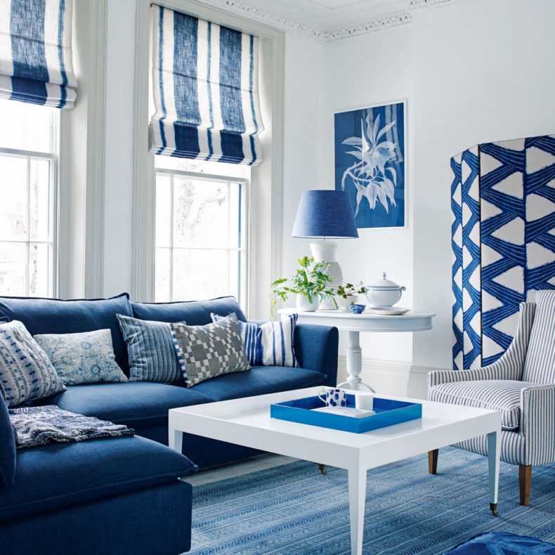 Один из способов добиться успеха в оформлении с помощью синего и белого – это сочетание интригующих узоров и силуэтов.