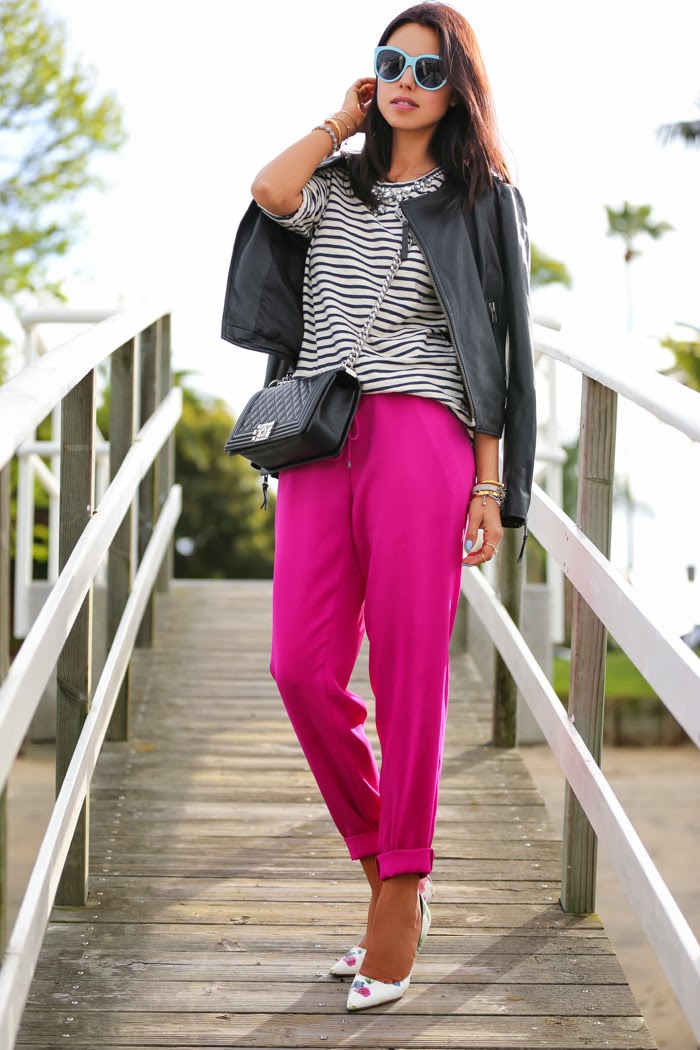 Отлично смотриться розовый с одеждой из денима. Кожаные черные брюки, голубая джинсовая рубашка и розовый пиджак с подвернутыми рукавами, ну и конечно черные туфли на высоком каблуке и стильная сумка — стильный образ в стиле casual создан.