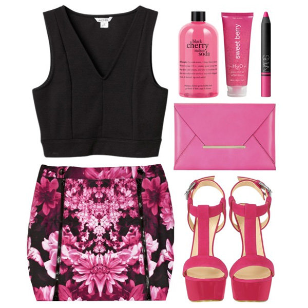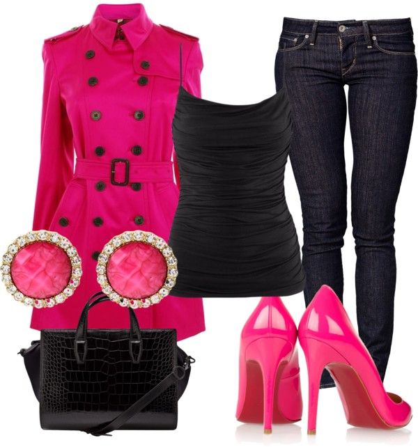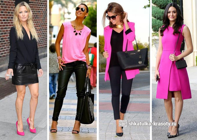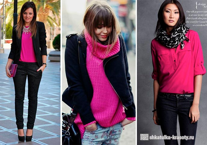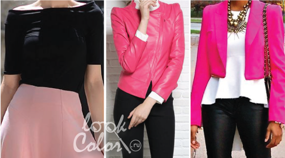 Для такого сочетания розового цвета подходят в праздничные, эпатажные наряды. В повседневной жизни используют контраст только нежно-розовый + бордо. Чтобы сделать лук более спокойным в него можно добавить белый, синий, серый акцент.