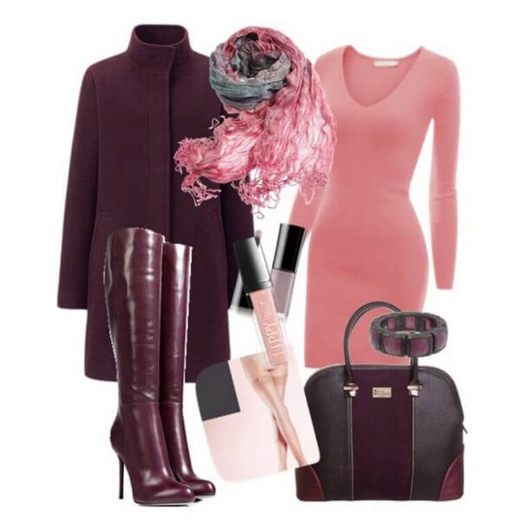 Розовый — легкость и безмятежность. Соединив эти два цвета, образ получится ярким и вызывающим, благодаря темному оттенку женщина не будет выглядеть как подросток.