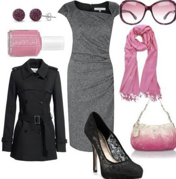 Одно из правильных сочетаний розового — с серым цветом. Скучный серый раскрывается в окружении розового, становится пастельным, уютным. Важно, конечно, обращать внимание на оттенки, которыми оба так богаты. Так, серый цвет брать лучше светлый, ровный, а розовый – нежный, приглушенный, не яркий. Отлично подойдет для офиса, где нет строгого дресс-кода наряд из розового платья и серого кардигана, серый сапог и сумки. Для повседневности, для прогулок и дружеских встреч можно надеть розовый легкий джемпер, серые брюки, на шею изыскано повязать серый шарф-арафатку, дополнить образ серой сумкой и яркими балетками – удобно и привлекательно.