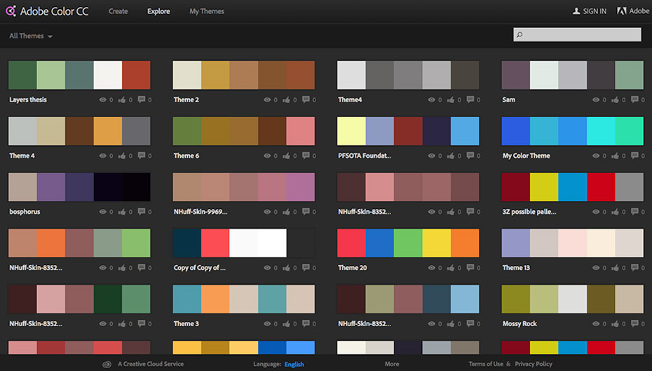 В разделе Explore, вам предоставляется библиотека предварительно загруженных цветовых тем от Adobe, которая является отличным маленьким инструментом, если вы застряли в поисках цветовых идей.