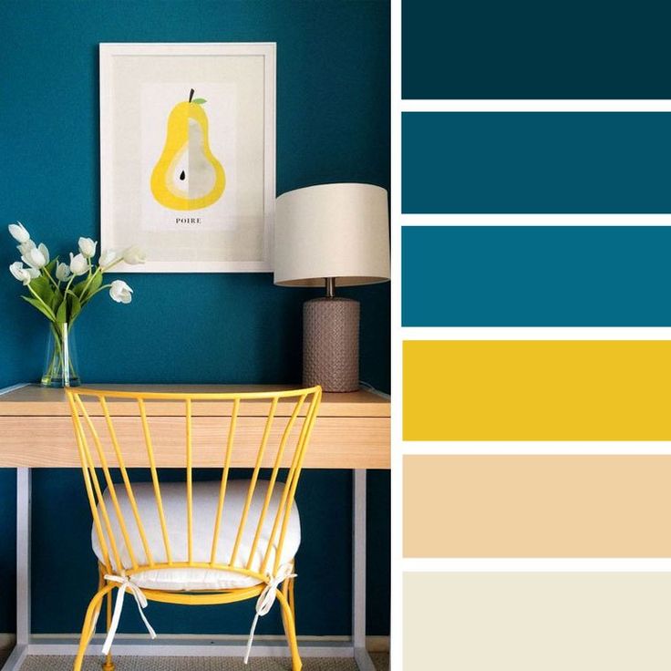 Эта комбинация напоминает о лете и заряжает энергией. Она идеально подойдет для интерьера гостиной или домашнего офиса. Особенно смелые могут покрасить стены в глубокие оттенки, но если вы предпочитаете более спокойную атмосферу, ограничьтесь яркими элементами декора.