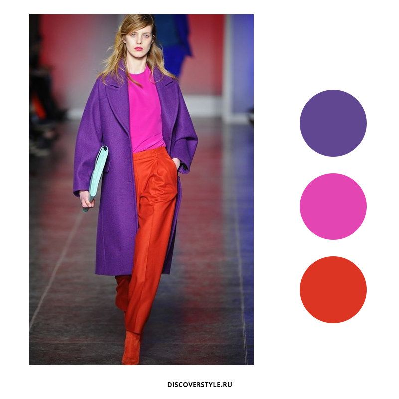 Электрическая фуксия — один из элементов образов в стиле Color Block. Многоцветные сочетания подходят для тех, кто не любит серости и стремится к индивидуальности. Важно грамотно подобрать цвета, чтобы выглядеть гармонично. Для начала выберите оттенки, близкие по цветовому кругу, например, фуксия и оранжевый. Далее можете вводить третий и четвертый цвет в образ. Избегайте одежды с рисунком и принтами.
