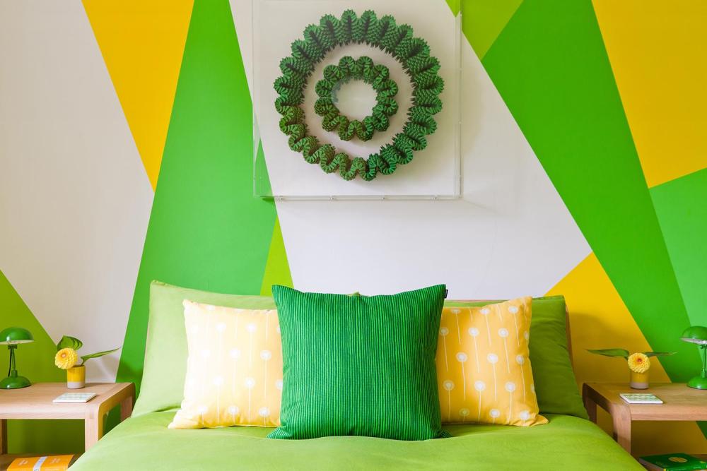 Комбинация зеленого цвета с бледно-желтой стеной.