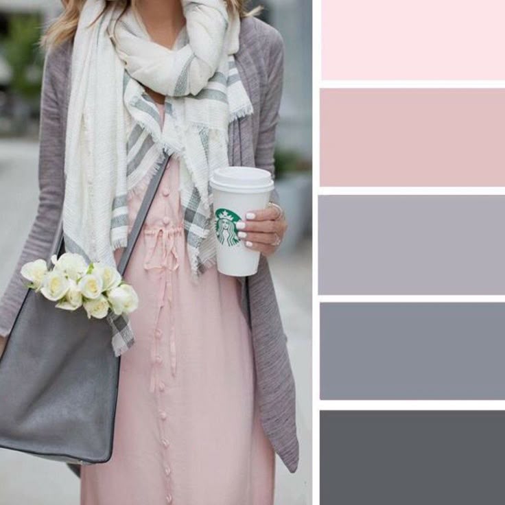 Для не слишком сладкого женственного образа сочетайте серый с розовым. Светло-серый дополнит румяно-розовый, а более темный серый сделает его более заметным.