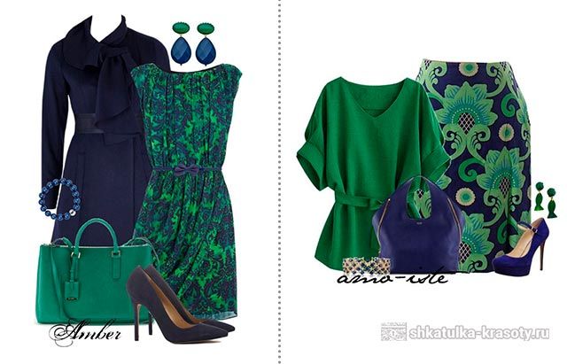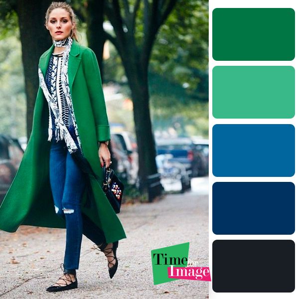 Стилисты отмечают, что сочетание зеленого с синим очень универсально и прекрасно подойдет девушке с любой внешностью. Тандем не требует практически никаких дополнений. Но если есть желание сделать ансамбль более контрастным, следует добавить черный, белый, желтый или золотой цвета.