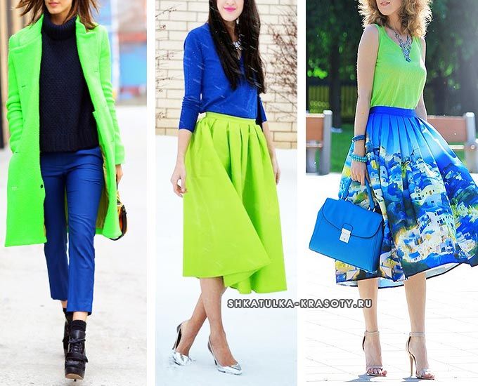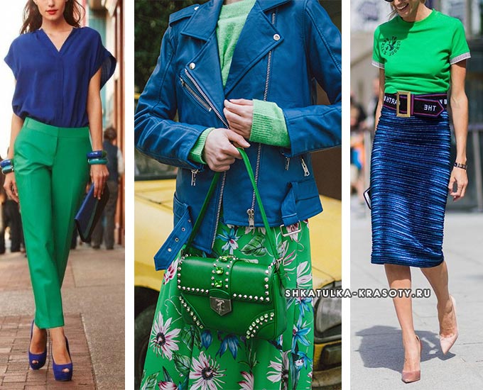 Сочетание ярких цветов сегодня очень популярно. Особым успехом пользуются эффектные, непривычные глазу тандемы. Например, соединение в одном ансамбле зеленого и синего. Такое сочетание сделает образ чарующим и таинственным.