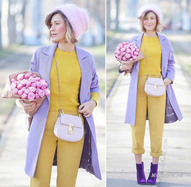 Начну с более легких сочетаний – желтого и сиреневого. На фото справа – мягкое сочетание солнечно-желтого и нежно-сиреневого. Здесь никакого драматизма нет, потому что цвета светлые и легкие, очень приятные. Очень симпатичный вариант.
