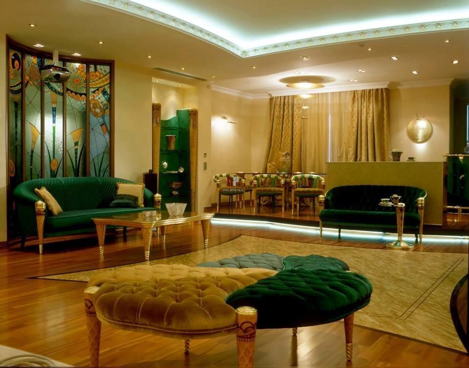 Сам по себе зелёный оттенок расслабляет, успокаивает и настраивает на позитив. Золото также вызывает самые приятные ассоциации с теплом, светом, славой и, разумеется, роскошью. Перебарщивать с золотом не стоит. При этом акцентом и самим характером интерьера можно управлять фоновым или основным оттенком.