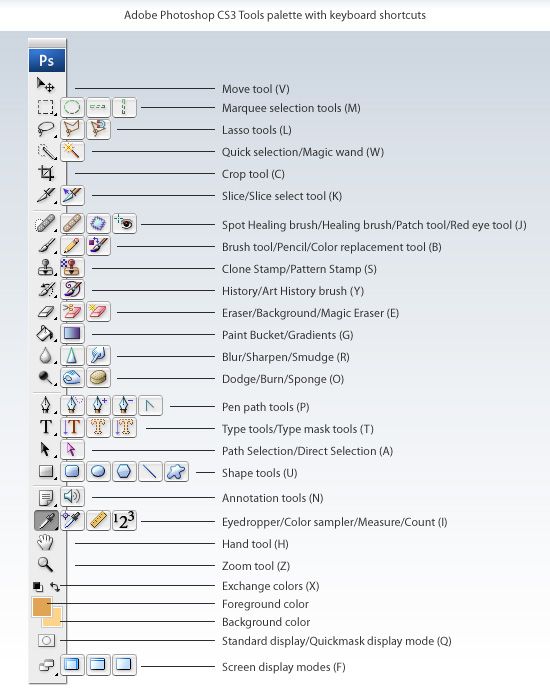 Доступ к инструментам, расположенным на вертикальной панели инструментов, также можно получить с помощью сочетаний клавиш или просто щелкнув нужный инструмент визуально . Многие из этих наборов инструментов содержат несколько параметров, которые можно прокручивать, просто многократно нажимая сочетание клавиш для этого инструмента. Ярлыки инструментов Photoshop