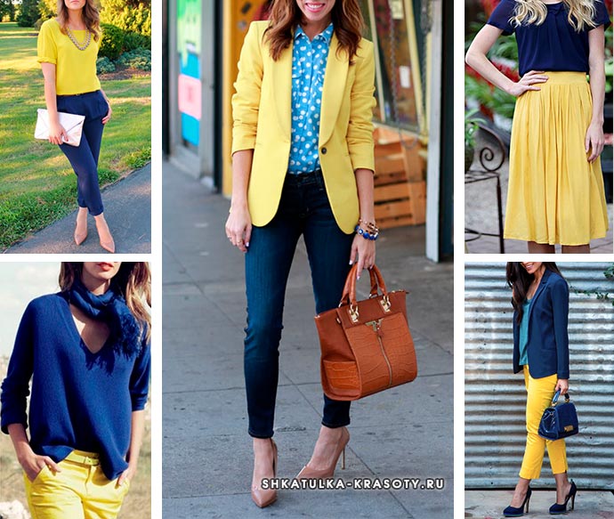 Сочетание темно-синего с желтым и белым создаст спортивный и динамичный образ.