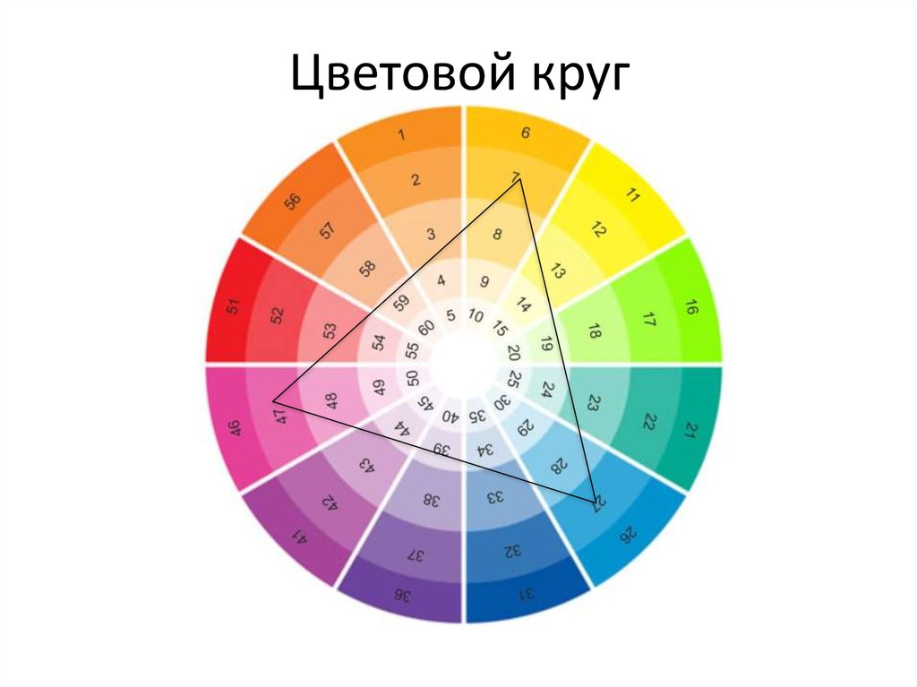 Цвета на круге расположены в таком порядке, что если наложить на него несложную схему, то получится гармоничное сочетание. Например, берем схему в виде треугольника, накладываем поверх круга и видим самую простую гармонию.