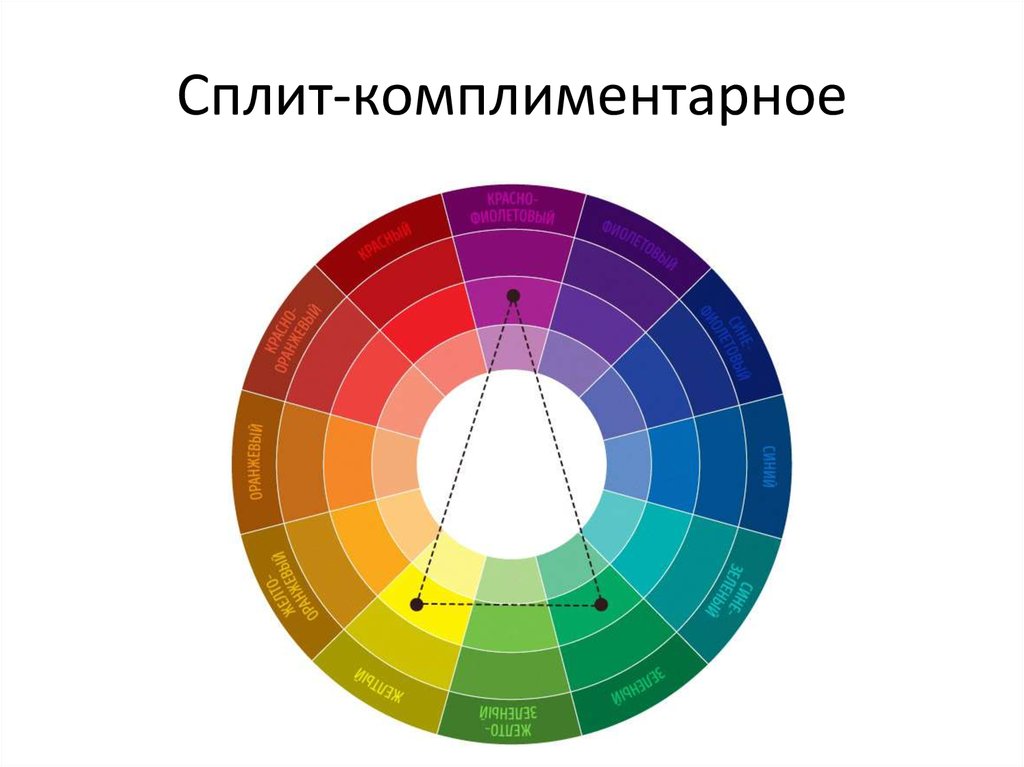 Сочетание из трех цветов. В отличие от обычной комплементарной схемы напротив главного цвета находится не один, а два соседних. Такая схема выглядит мягче и спокойнее.