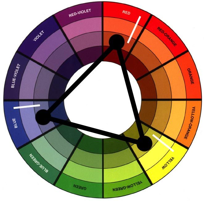 Для того чтобы сделать выбор цвета необходимо равносторонний треугольник наложить на круг Иттена. Так мы получим 3 сочетаемых цвета. Используют данный способ для того чтобы разнообразить необходимую цветовую стилистику.