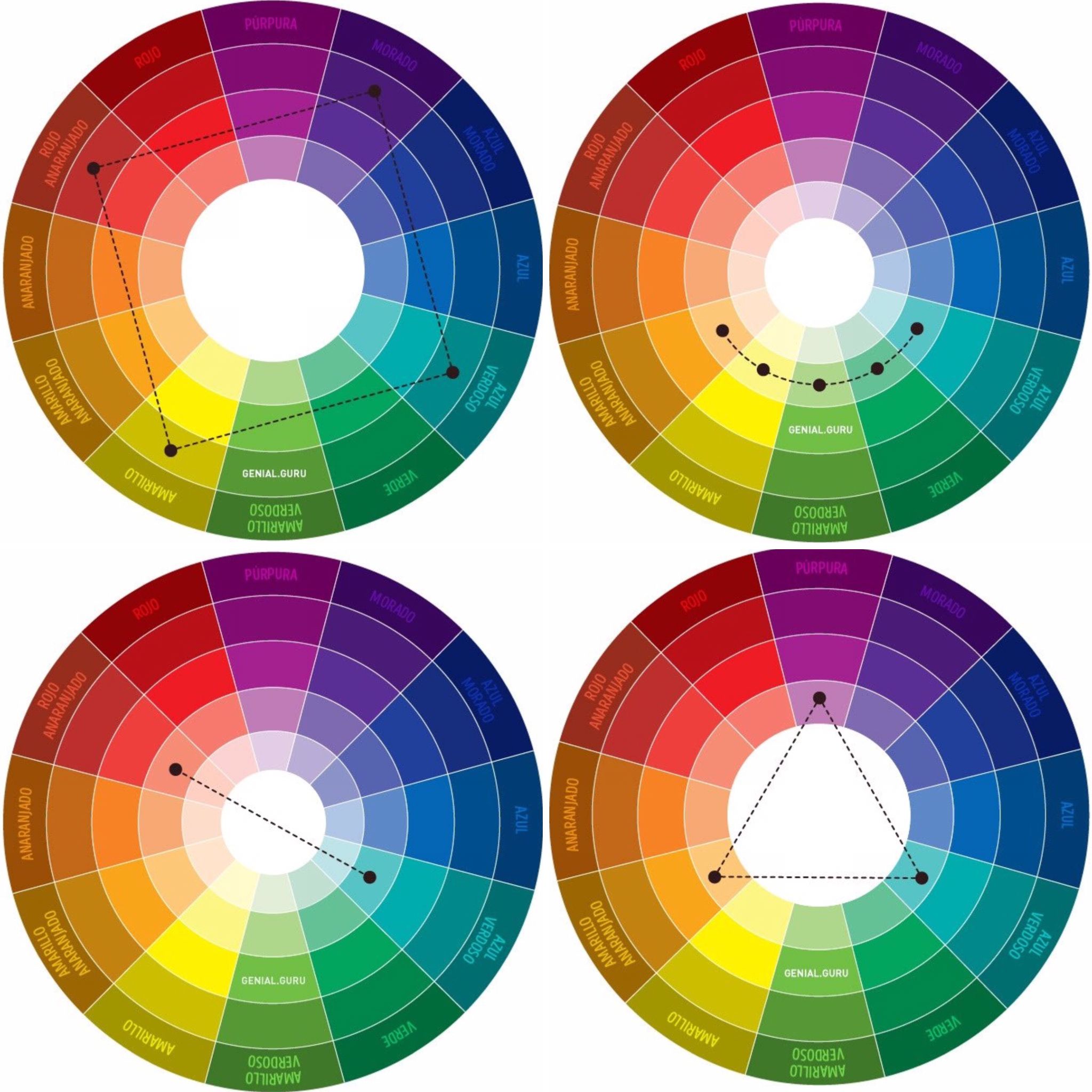 Вы можете прочитать подробное объяснение каждой из комбинаций в этой статье, но мы хотели сделать инфографику, чтобы выделить основные характеристики цвета , чтобы служить кратким изложением, чтобы оно всегда присутствовало, когда нам нужно создать нашу цветовую палитру.
