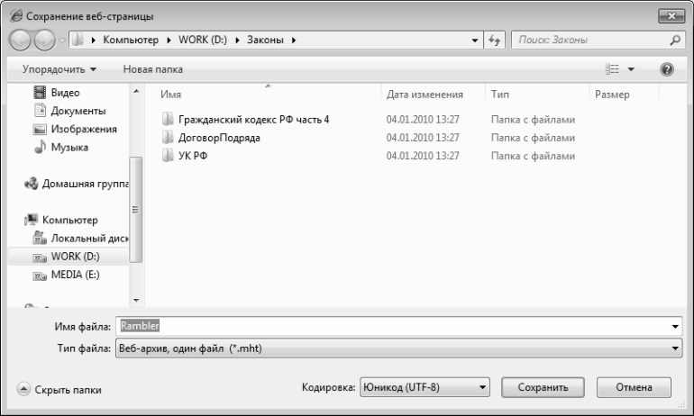 Сохранение в качестве веб-страницы: дополнительные параметры