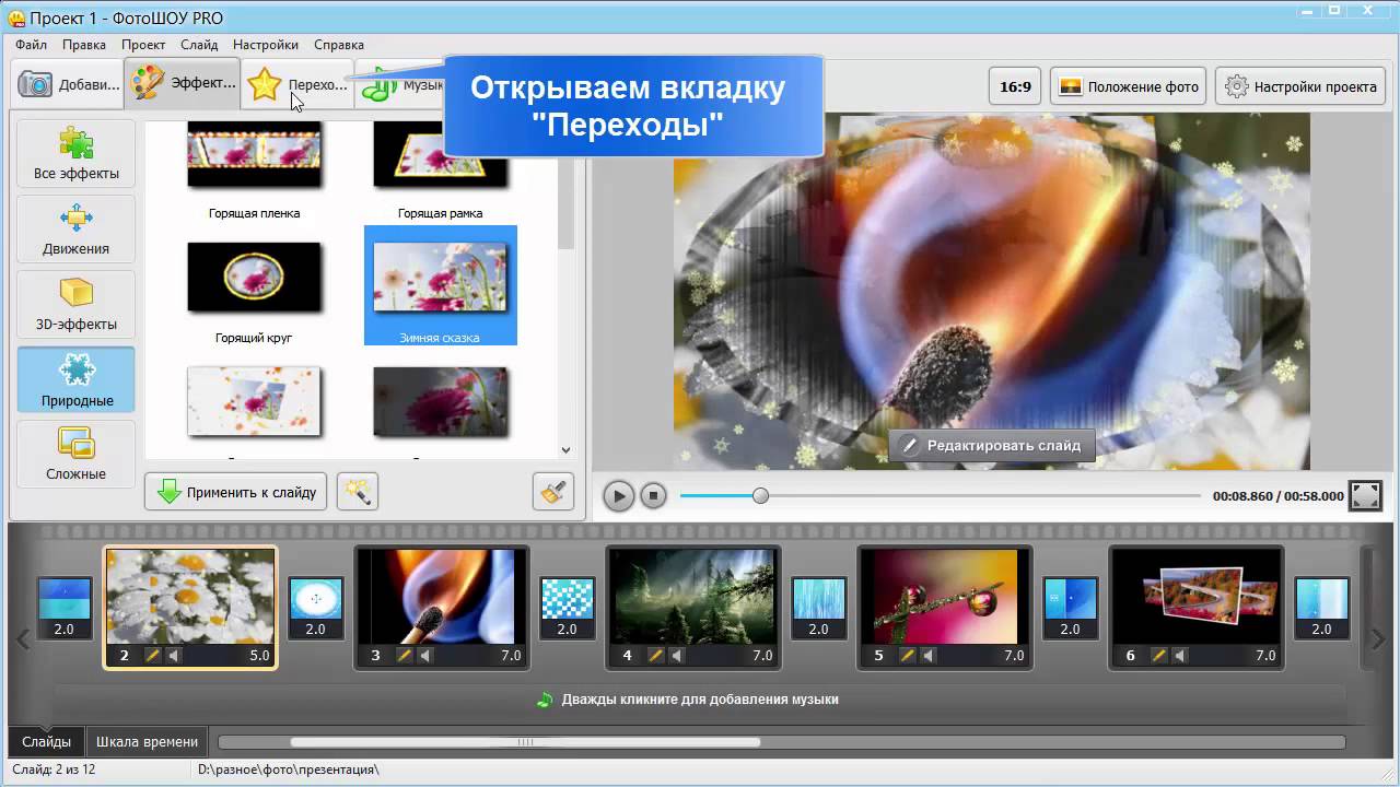 Настройте порядок, плавные переходы и музыку