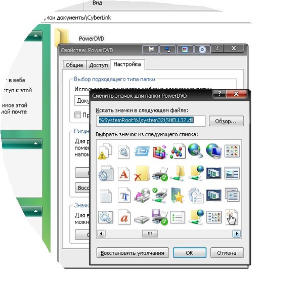 Перейдите на вкладку «Настройка», а затем в разделе «Значки папок» нажмите «Сменить значок…».
