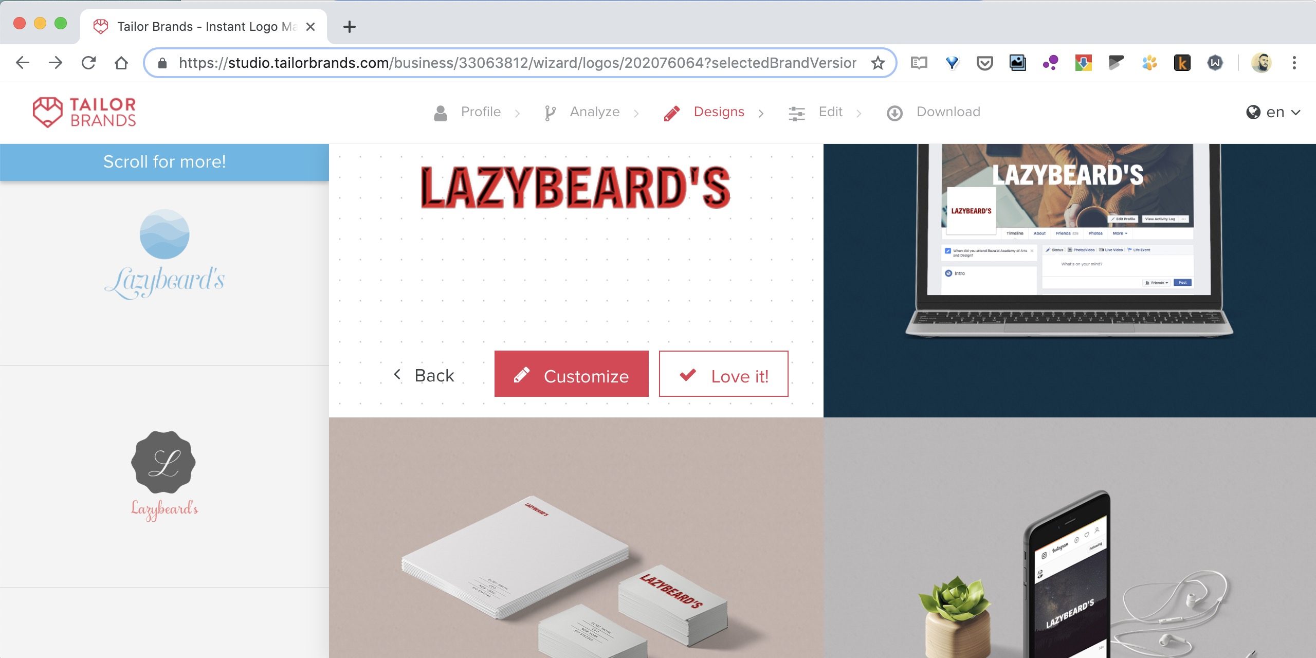 Работает примерно так же, как и предыдущий сервис — пользователь указывает название компании и предпочтения по дизайну, а сервис генерирует картинку. Можно дорабатывать отдельные детали фирменного знака — шрифты, значки, цвета, текст. Результат работы можно загрузить в разных форматах.
