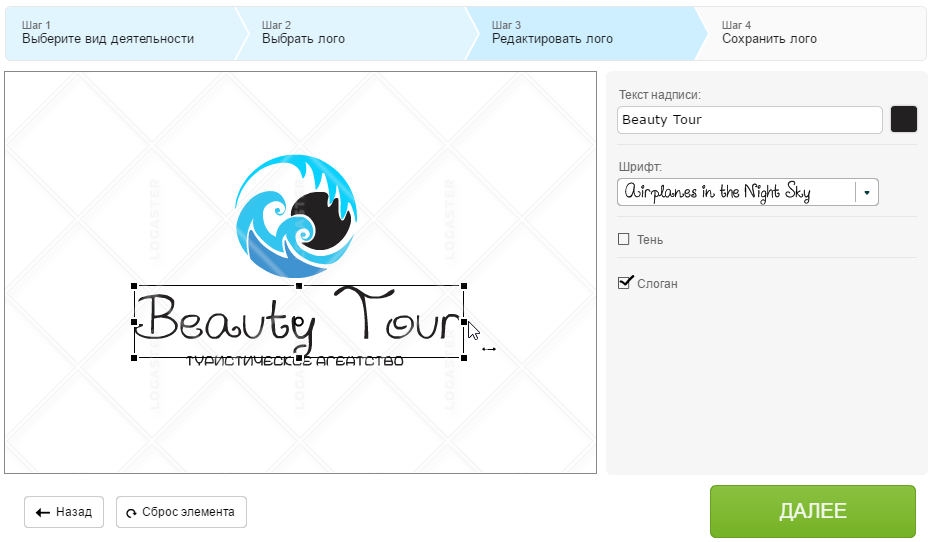 Logamaster отечественный сервис, который уже многие годы даёт свои плоды. Его преимущества в том, что меняется цвет текста, макеты легко редактируются и добавляются новые графические элементы.
